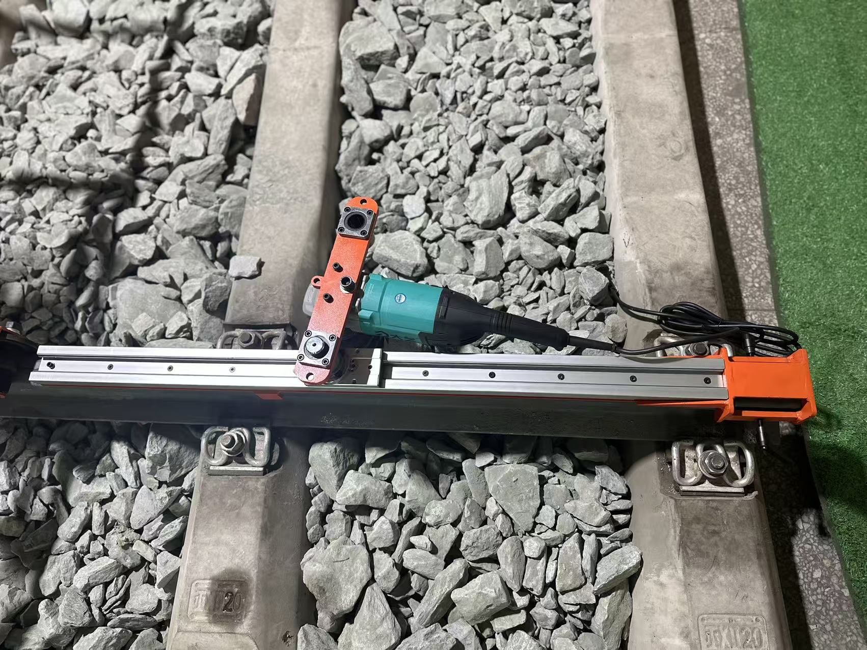 3、将动力总成通过快速导向滑套挂在滑轨上,并锁紧顶丝,使打磨砂轮与轨腰精准贴合,并检查接触状态。