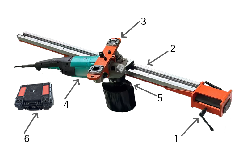 1、锁紧销 2、定位滑轨 3、快换导向套 4、动力总成 5、打磨砂轮 6、电控箱